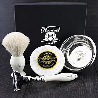 Rasoir de rasage Haryali London 3 Edge, brosse de rasage pour cheveux blaireau blanc, savon de rasage et bol de rasage ensemble de rasage parfait pour hommes